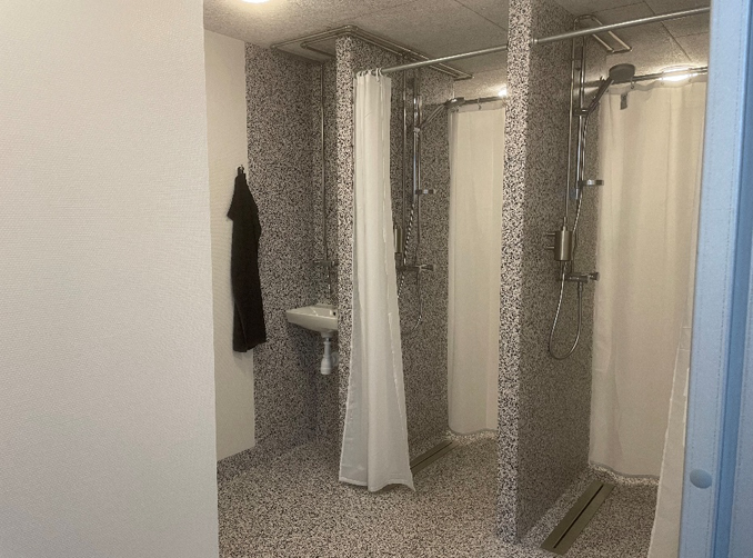 Baderummet er delt på midten af to stk. brusekabiner, som man skal igennem for efterfølgende at komme ud i det rene område. I det rene område er der alt det tøj, som man skal bruge. Og både i det rene og det urene område er der et toilet.