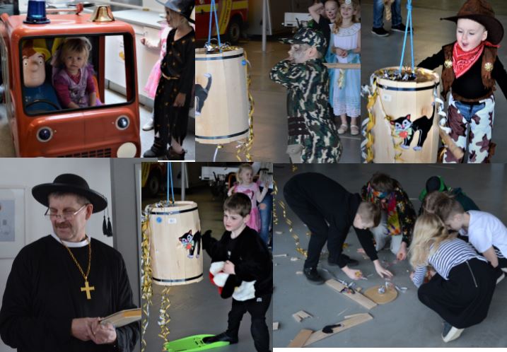 Brandbilerne var kørt ud, og i garagerne var to tønder hængt op, så der både kunne slås af de store og de lidt mindre børn, og det tog ikke lang tid, før de to tønder var slået til pindebrænde og godterne lå på gulvet, hvor de for øvrigt ikke fik lov at ligge længe, før børnene havde samlet dem op.