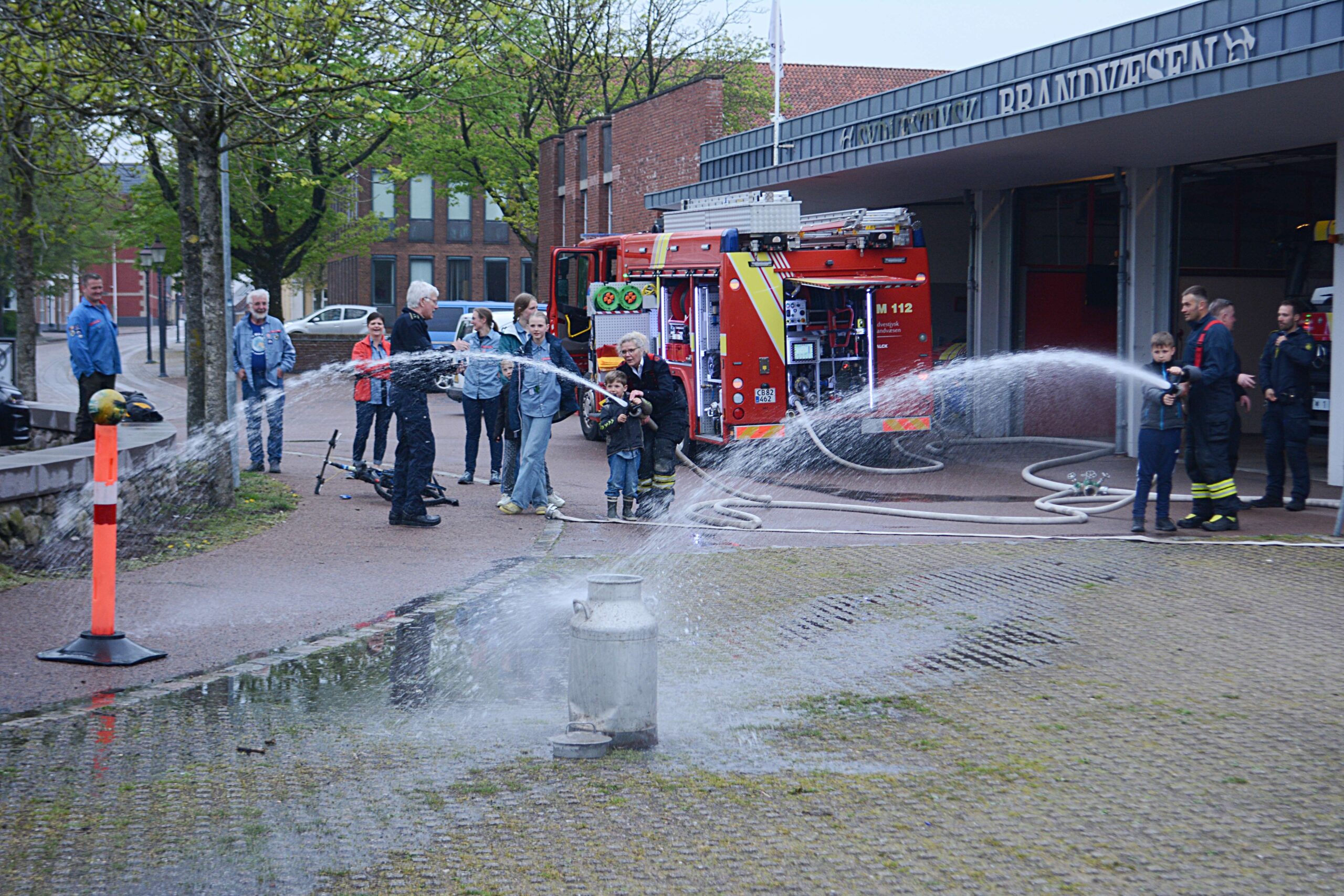 Der blev også lejlighed til at sprøjte med vand, idet de unge mennesker blev udstyret med et strålerør og ved hjælp af vandstrålen skulle de spule en bold ned fra en opsats samt fylde en gammel mælkejunke med vand.