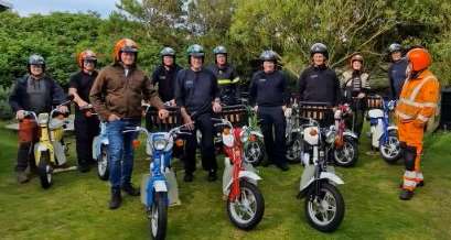 – Kollegerne fra Ribe skulle se både stationen i Nordby og i Sønder Ho samt de frivilliges base og kystredningsstationen i Sønder Ho. Vi kunne selvfølgelig have valgt at køre dem rundt i en minibus, men jeg synes, det var sjovere, hvis de selv skulle køre rundt. Så de fik besked om at møde på en bestemt adresse, og jeg havde lejet 14 knallerter, så de fik en hver. Og så var det bare op på knallerten, fortæller Rasmus Brinch.