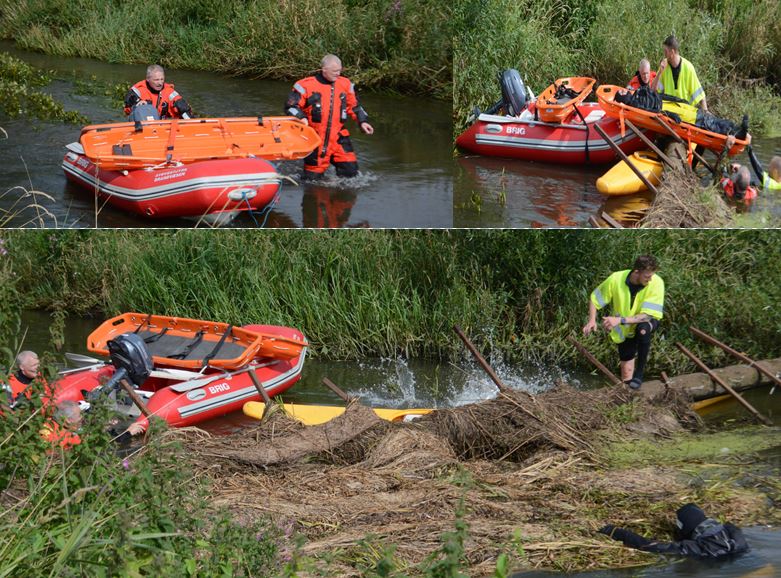 Og under en virkelig eftersøgning, vil det ofte være nødvendigt, at brandmænd iført vandtætte dragter må i vandet for at søge efter forulykkede i den megen grøde, der er langs bredderne af åløbene.