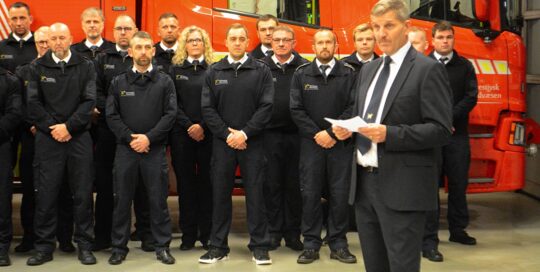 Beredskabschef Jens Mølgaards tale ved nytårsparaden fredag på stationen i Ribe.