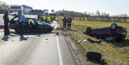 To kvæstet og hovedvej spærret efter voldsomt uheld