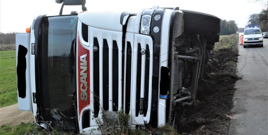 56 tons tung lastbiltog skred i grøften og væltede ind på mark