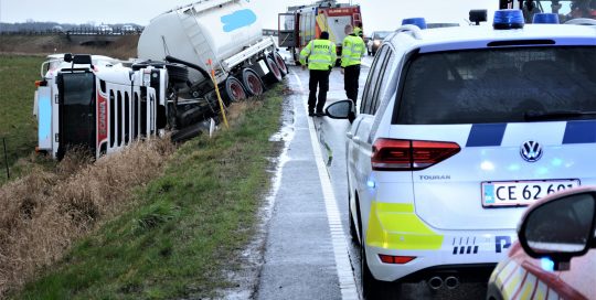 Lastbil skred ned i grøften og lagde sig på siden ved Ringvejen