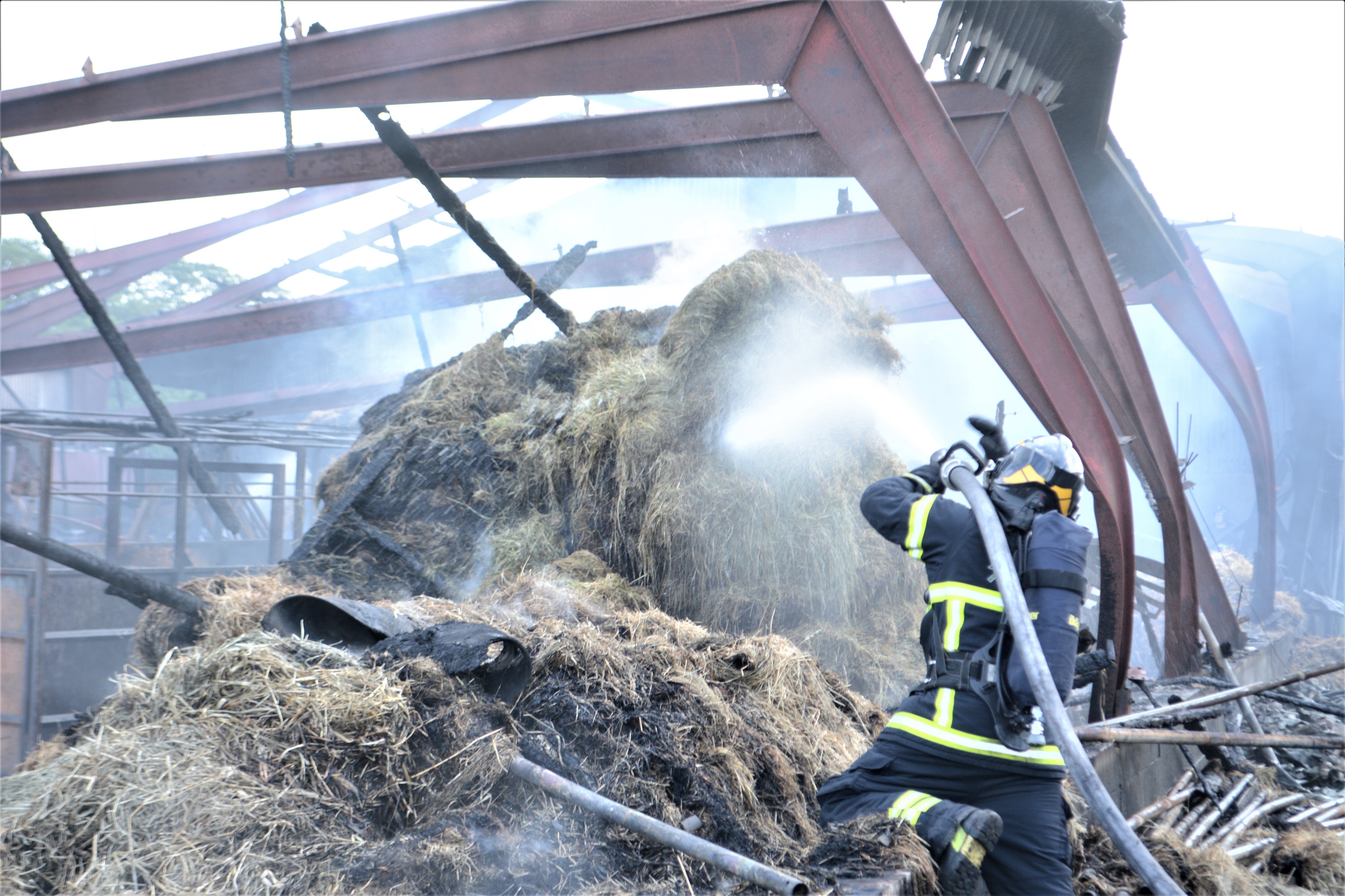 Maskinhuset var godt fyldt op med maskiner, traktorer, halm og dæk, der gav god næring til ilden og blev flammernes bytte. Ilden og varmen var så voldsom, at de svære jernbuer, der bar tagkonstruktionen, smeltede som plastik, der kommer for tæt på varme.