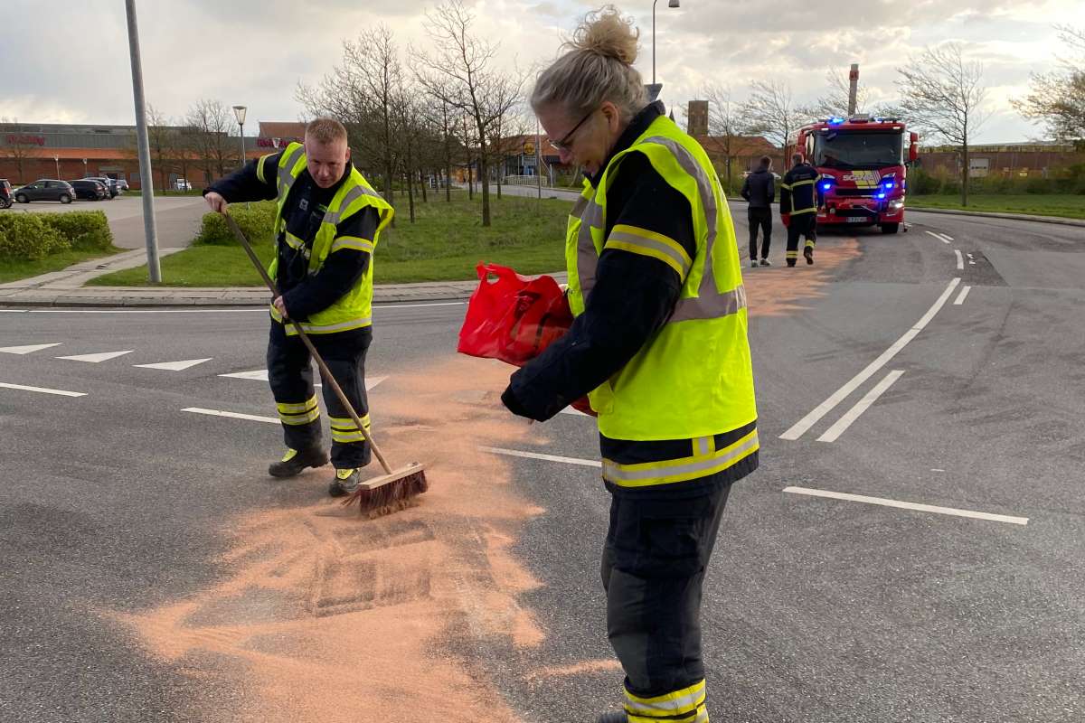 Brandfolkene måtte sprede ”kattegrus” ud på vejbanen og senere rense den med vand, før bilisterne igen kunne færdes sikkert på kørebanen det pågældende sted.